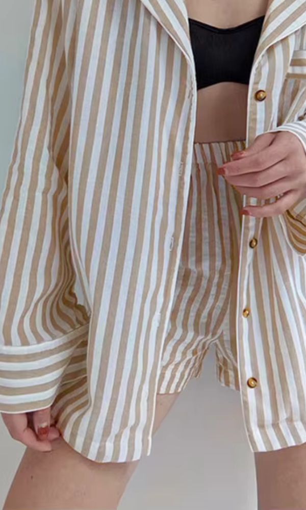 Soft and comfortable 100% Cotton Boxer Set in latte stripe.